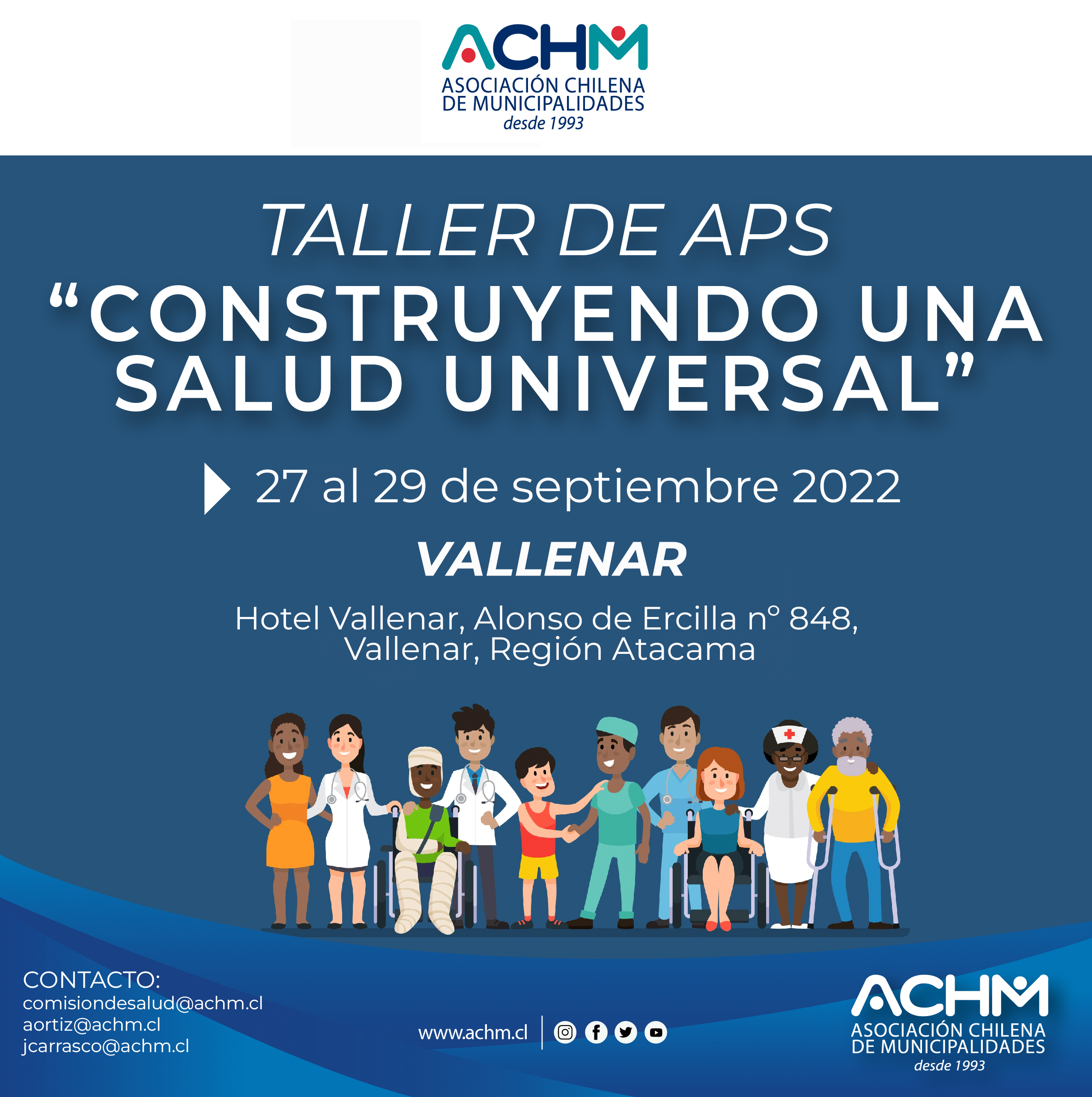 Como presidente de la Comisión Salud de la ACHM, lo saludo muy cordialmente y a la vez tengo a bien invitarles a un Taller de la Comisión de Salud «APS, Construyendo una Salud Universal desde la Comuna de Vallenar», dirigido a Alcaldes, Alcaldesas, Concejales, Concejalas, directores/as y Funcionarios de la Salud Municipal.
